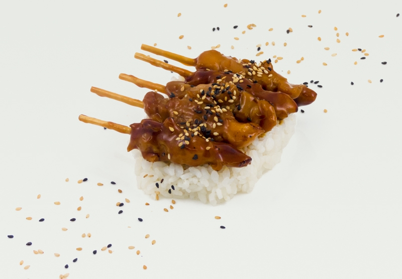 Brochetas de pollo al yakitori acompañado de arroz de sushi, Gohan. 4 brochetas por ración.