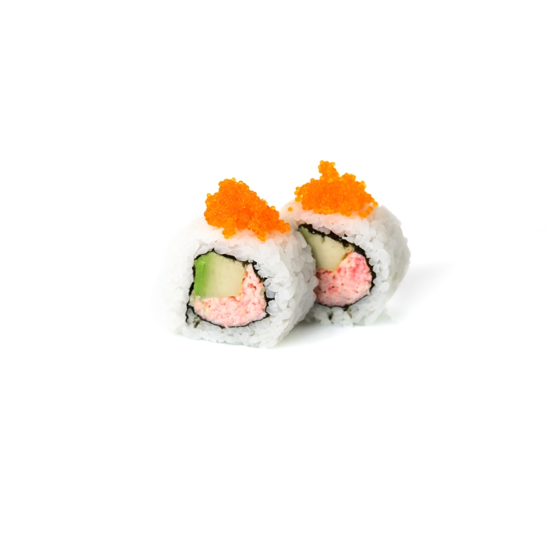 Uramaki de kanikama rallado, mahonesa, aguacate, sésamo y por encima huevas de masago.