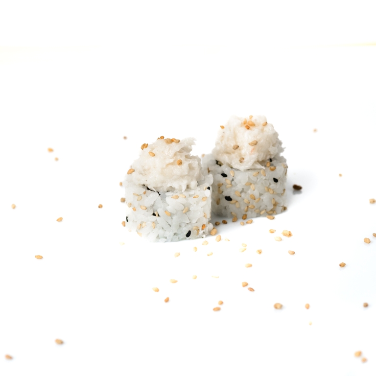 Uramaki relleno de aguacate, encima pez mantequilla picado aliñado con salsa trufada y chispitas de sesamo garrapiñado.