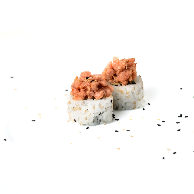 Uramaki relleno de aguacate, encima atún picado aliñado con salsa de cebolla caramelizada.