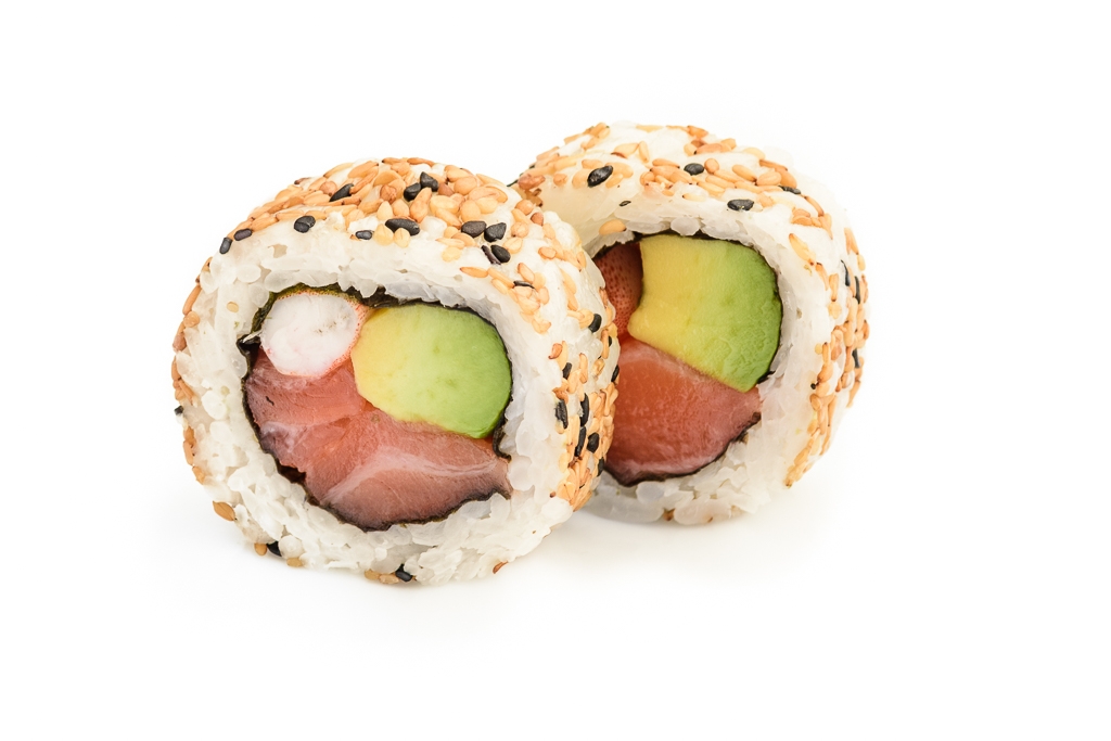 Uramaki relleno de langostino cocido, salmón y aguacate.