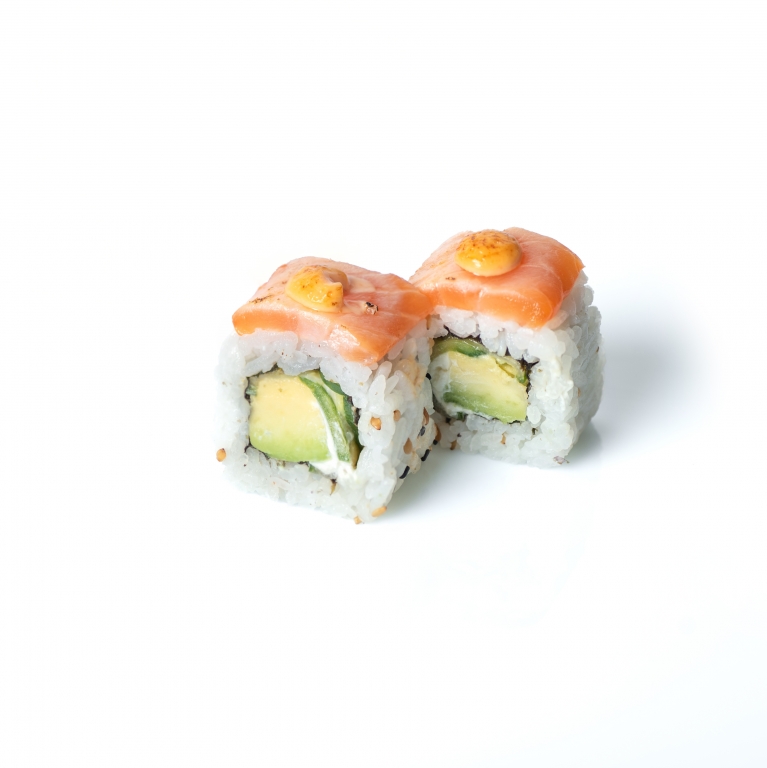 Uramaki relleno de pepino sunomoto, phila sin lactosa y aguacate, por encima salmón con salsa spicy, flambeado.