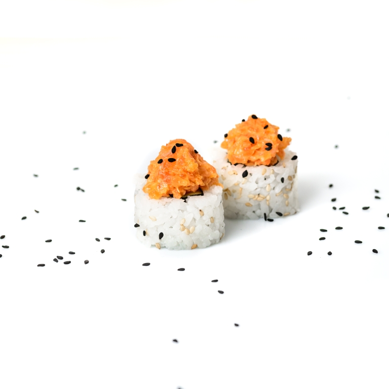 Uramaki relleno de aguacate, encima salmón picado aliñado con salsa spicy.