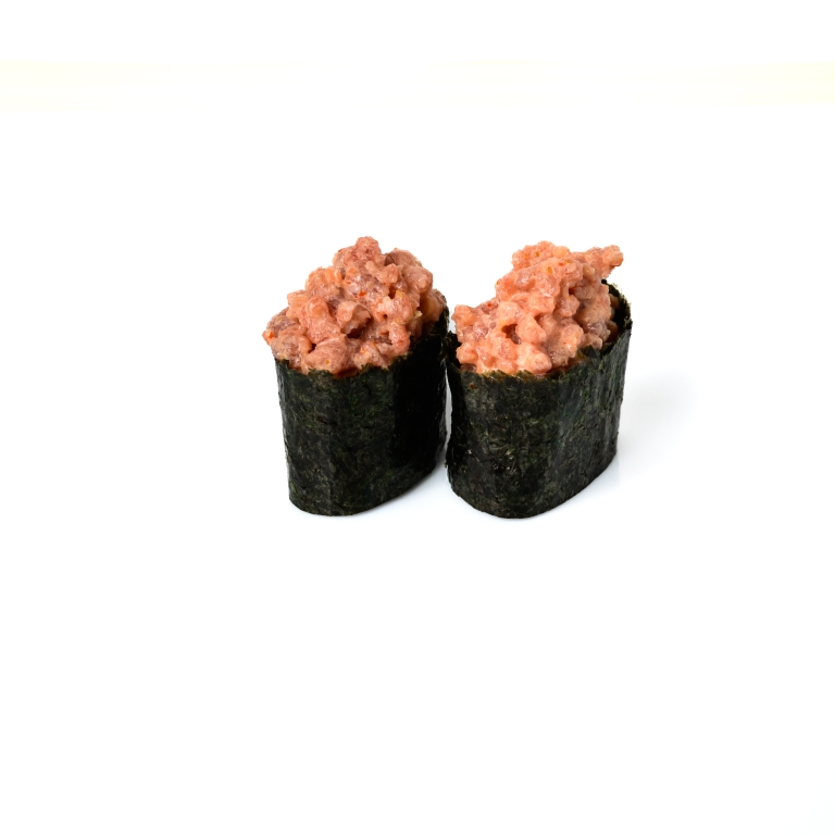 Gunkan de atún picado con una salsa ligera de cebolla caramelizada y un toque de aceite de sésamo.